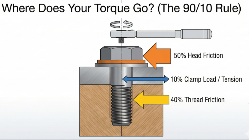 The widely accepted 90/10 Rule explains why torque rarely translates directly to tension: for a standard dry screw, only ~10% of applied torque converts to usable clamping tension. The remaining 90% is lost to friction — ~50% between the screw head and bearing surface, and ~40% between the mating threads.